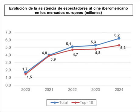 ![]() Panorama Audiovisual Iberoamericano 2025 ![]() ![]() ![]() ![]() 2025 El cine iberoamericano en Europa muestra una evolución creciente, con una amplia aceptación en países como Francia, Reino Unido o Italia. La ficción es la reina de la programación televisiva, por encima de informativos o programas de entretenimiento. Está nueva edición del Panorama Audiovisual Iberoamericano agrupa datos de la ficción y el cine iberoamericano, tanto dentro como fuera de sus fronteras, ofreciendo datos del comportamiento de nuestro audiovisual, para la futura toma de decisiones por parte de los diferentes jugadores del mercado, las tendencias existentes y aportando opiniones de expertos en la materia sobre el ecosistema digital, el mapa de oportunidades audiovisuales o los retos ante la inteligencia artificial. El cine iberoamericano es un valor al alza en Europa, donde el número de estrenos cinematográficos en los países de la muestra han pasado de los 208 en 2023, a los 247 en 2024. Y también esto mismo se puede contrastar en la evolución de los espectadores europeos de cine iberoamericano. Donde se produce un incremento progresivo desde el año de la pandemia hasta finales del periodo analizado. Aunque Europa es un mercado tradicional para las producciones iberoamericanas también encontramos que nuestro audiovisual llega a otros mercados, como el asiático, aunque para ello se requiere colaboración institucional y estrategias de promoción, coproducción y distribución. En el periodo analizado, Corea del Sur y Arabia Saudí son los mercados con mayor número de estrenos y espectadores. Los títulos iberoamericanos con mayor éxito en estos años en Asia fueron Robot Dreams (España, Francia), Momias (España), Spencer (Chile, UK, USA) y Parpadea dos veces (México, USA). Y también dentro de nuestras fronteras se visualiza el crecimiento continuo de la asistencia de espectadores a ver cine nacional. Desde el año de la pandemia se observa la recuperación existente, alcanzándose en 2024 los 42.2 millones de espectadores. Todo ello, gracias a películas como las siguientes que se situaron en el Top-20 de los países iberoamericanos en el año 2024: